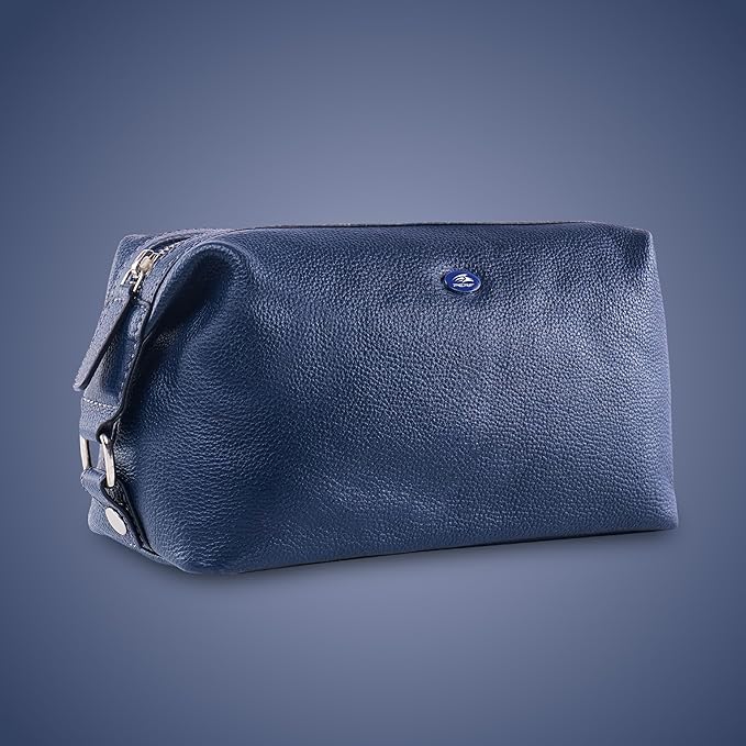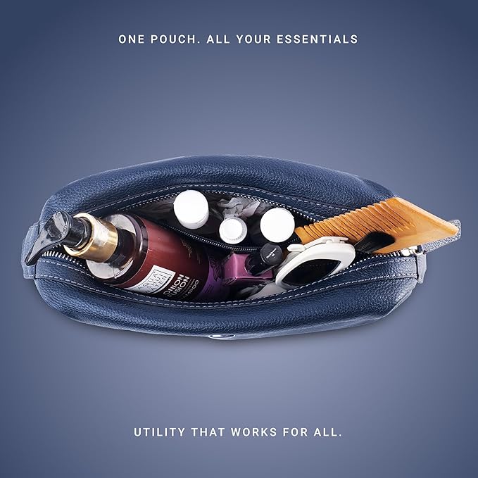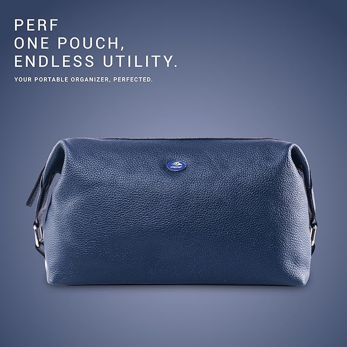 PERF Genuine Leather Travel Kit Bag | Unisex Toiletry Bag & Makeup Organizer | Multipurpose |Coated Nylon + Punch Leather Pouch for Men & Women with Adjustable Side Loops (Navy)